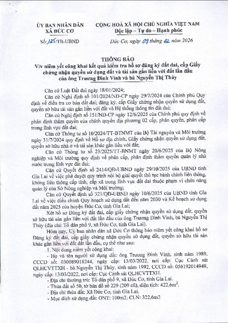 Thông báo niêm yết, công khai kết quả kiểm tra hồ sơ đăng ký đất đai, cấp GCN quyền sử dụng đất và tài sản gắn liền với đất lần đầu của ông Trương Đình Vinh và bà Nguyễn Thị Thủy