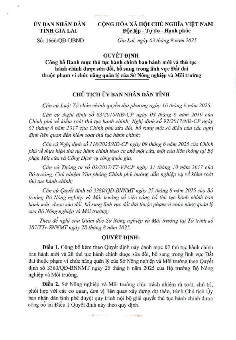 QUYẾT ĐỊNH Công bố Danh mục thủ tục hành chính ban hành mới và TTHC được sửa đổi bổ sung trong lĩnh vực Đất đai thuộc phạm vi chức năng quản lý của Sở Nông nghiệp và Môi trường
