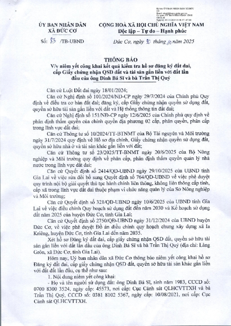 Niêm yết, Công khai cấp GCN Quyền sử dụng đất, tài sản gắn liền với đất lần đầu cho ông Đinh Bá Sĩ và bà Trần Thị Quý 01/11/2025, 10:09:46 - Lượt xem: 0 Tweet Thêm vào danh sách Báo xấu Thông tin tài liệu Niêm yết, Công khai cấp GCN Quyền sử dụng đất, tài sản gắn liền với đất lần đầu cho ông Đinh Bá Sĩ và bà Trần Thị Quý