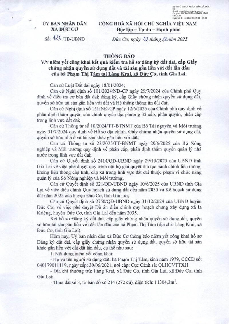 Thông báo niêm yết, công khai kết quả kiểm tra hồ sơ đăng ký đất đai, cấp GCN quyền sử dụng đất và tài sản gắn liền với đất lầ đầu của bà PhạmThị Tâm ở làng Krai