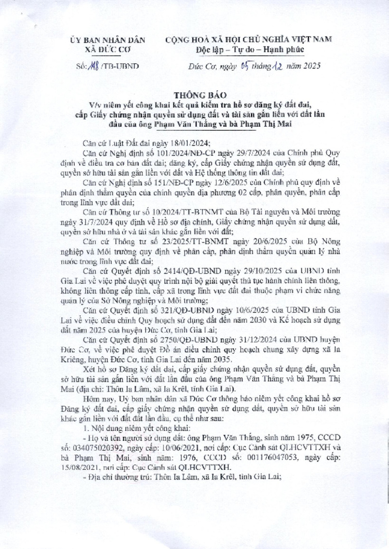 Thông báo niêm yết, công khai kết quả kiểm tra hồ sơ đăng ký đất đai, cấp GCN quyền sử dụng đất và tài sản gắn liền với đất lầ đầu của ông Phạm Văn Thắng và bà Phạm Thị Mai