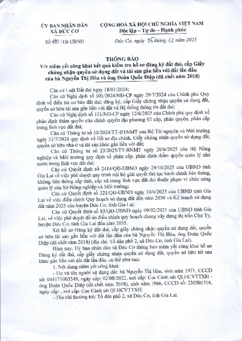Thông báo niêm yết, công khai kết quả kiểm tra hồ sơ đăng ký đất đai, cấp GCN quyền sử dụng đất và tài sản gắn liền với đất lầ đầu của bà Nguyễn Thị Hòa và ông Đoàn Quốc Diệp
