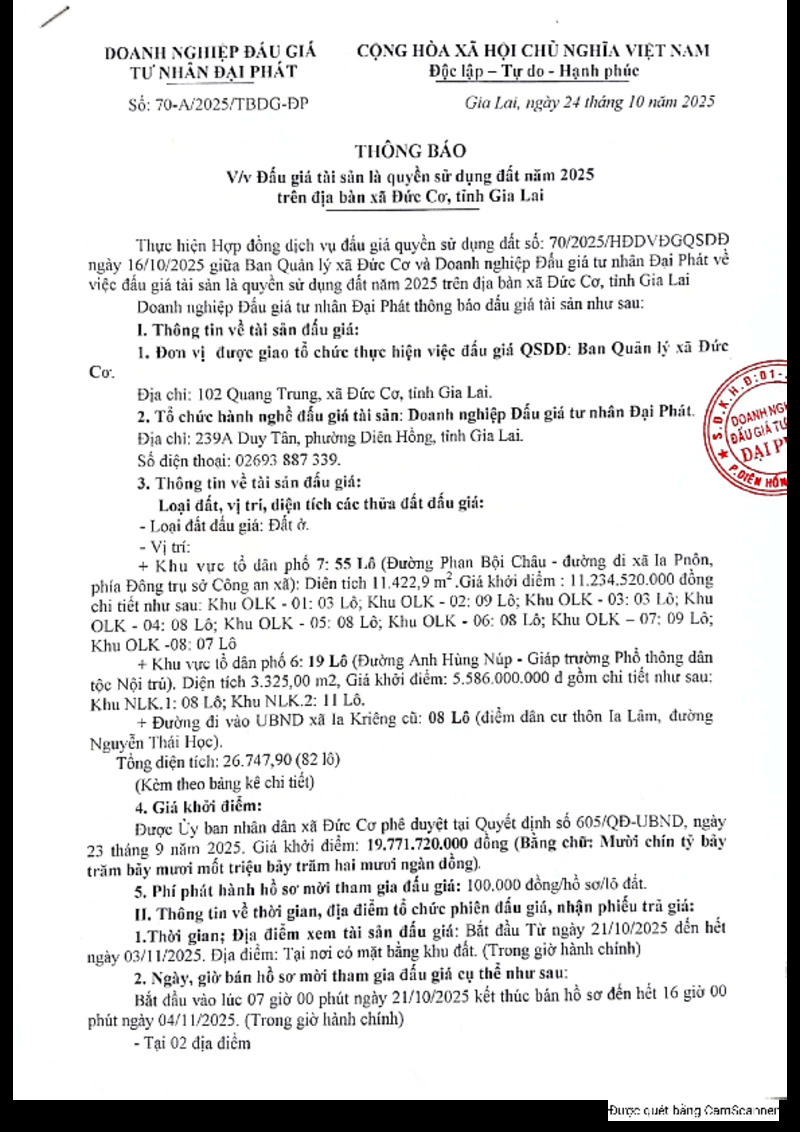 Thông báo đấu giá tài sản là quyền sử dụng đất năm 2025 trên địa bàn Đức Cơ 25/10/2025, 09:28:28 - Lượt xem: 6 Tweet Thêm vào danh sách Báo xấu Thông tin tài liệu Thông báo đấu giá tài sản là quyền sử dụng đất năm 2025 trên địa bàn Đức Cơ