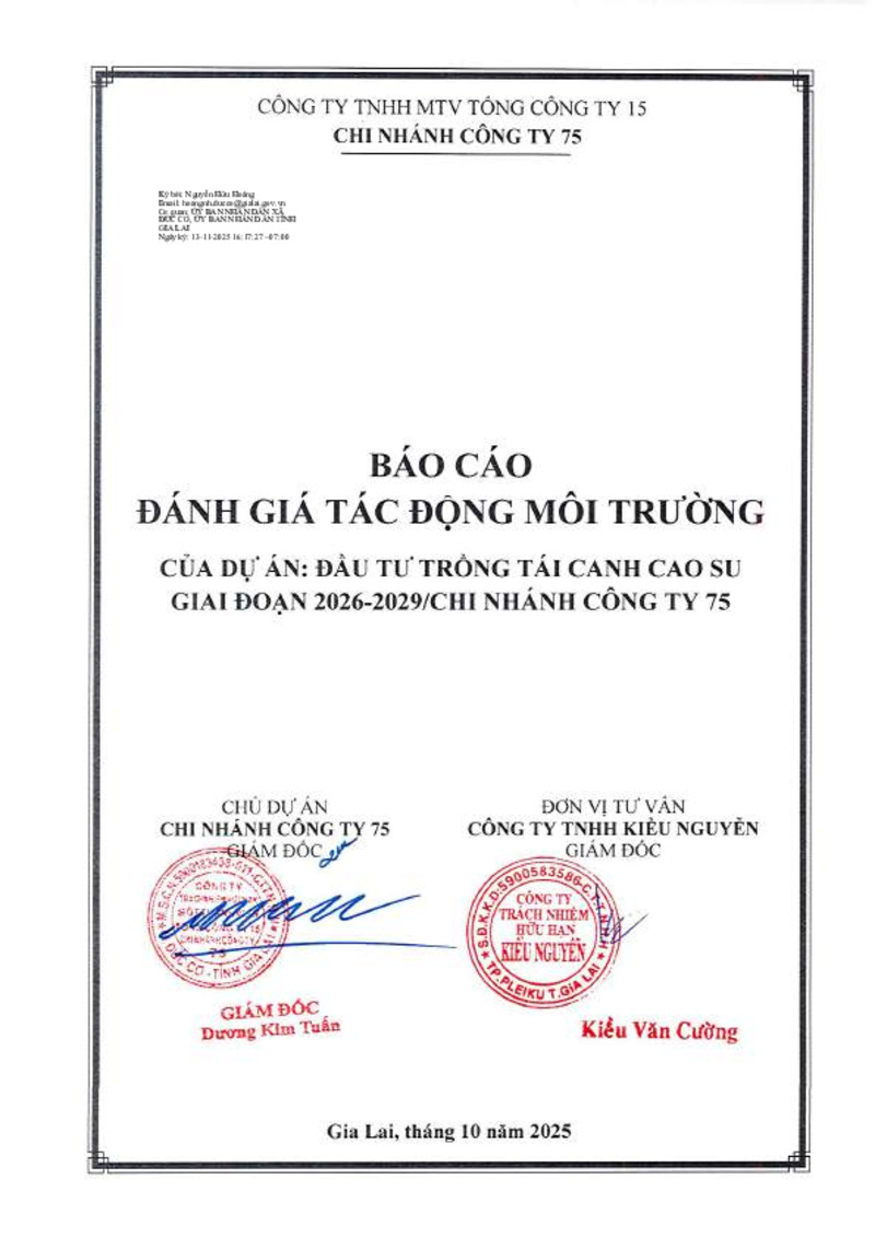 Báo cáo đánh giá tác dộng môi trường của Dự án"Đầu tư trồng tái canh cao su gia đoạn 2026-2029/ Chi nhánh Cty 75" 14/11/2025, 15:42:33 - Lượt xem: 2 Tweet Thêm vào danh sách Báo xấu Thông tin tài liệu Báo cáo đánh giá tác dộng môi trường của Dự án"Đầu tư trồng tái canh cao su gia đoạn 2026-2029/ Chi nhánh Cty 75"